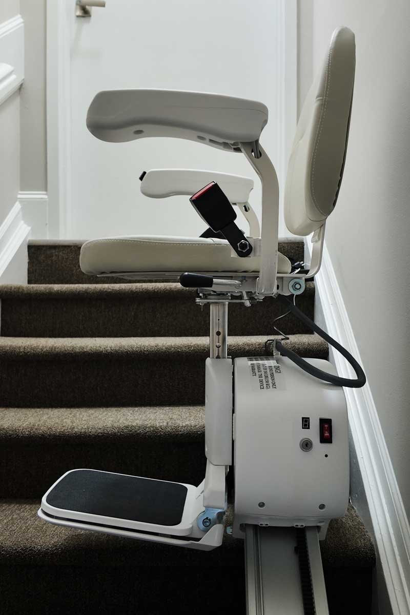 The Crest HD Stair Lift delivers exceptional versatility, heavy-duty performance, and advanced safety features. With a 350 lb. weight capacity, its universal design supports both left and right-side installation, while adjustable armrest width, seat height, and toggle control offer customizable comfort. A 2-position swivel seat ensures safe and easy transfers.